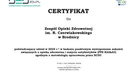 Informujemy, że nasz szpital otrzymał certyfikat potwierdzający udział w krajowym badaniu punktowym występowania zakażeń związanych z opieką zdrowotną i zużycia antybiotyków (PPPS HAI&AU 2025), prowadzonym w maju i czerwcu bieżącego roku.
